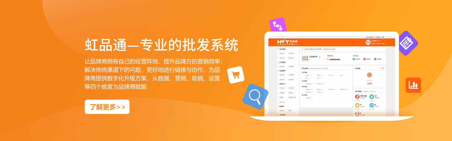 南寧虹品通軟件科技有限公司成立于2014年,是一家開發(fā)軟件技術服務公司。公司總部位于中國綠城南寧市,專注軟件行業(yè)系統支持和供應鏈大數據開發(fā),并將其應用于商業(yè)領域。掌握供應鏈系統研發(fā)、商品流通大數據、批發(fā)零售商城等核心技術,并持有多項技術專利和著作權。公司致力于幫助生產廠家、商品流通、銷售型企業(yè)向互聯網化轉型升級,利用互聯網獲取客戶、洞察市場、服務客戶